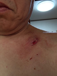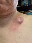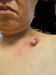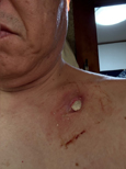 亡母が腹水が溜まった時に、里芋パスタが腹水を吸収したことを経験してますので、これが一番良さそうだと感じました。その翌日の朝、湿布を取ると、膿の部分が表面に押し出されていました。写真に収めろと声がするので、この日から毎日の様子を撮っていきました。3日後には、皮膚が破れて粉瘤の被膜が姿を現しました。そこに直に湿布するため、まさしく腫れ物に触るほど痛かっったです。こんなことがいつまで続くのかとふと思いましたが、一日二回、湿布を張り替えていくと、痛みは徐々に治まっていきました。粉瘤内部の血の色の液体が湿布によって押し出されるため、ガーゼを当てるようにしました。一週間後には、中の膿が表面に出始め、それが彼岸明けには、とうとう中の膿を排出しました