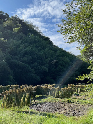 さて、先月の5日に無事稲刈りを終えることができました。幸い、曇り空で絶好の作業日和でしたので、翌日に疲れが残ることもありませんでした。それにしてもお米作りほど人との関わりを結びつけるものはないと感じます。総勢で20名ほどでの稲刈り。稲を刈る係、それを縛る係に、それを稲架にかける係、何年も家族で参加してる方は、小さかった子供さんが即戦力で、指示されることなく動いていて、誰かを手助けするという、この時代にいちばん大切なことが自然に身についているのです。これが日本人が本来持っている遺伝子に刻まれたものではないでしょうか。