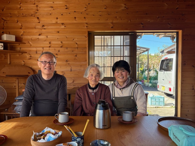 行って学ばれているそうです。その情熱が伝わってくる書を、解説を交えながら拝見させていただきました。写真に収めなかったのが悔やまれますが、また次回のお楽しみということだと思います。お話しをしていると95歳という年齢を忘れてしまうほど、いろいろな話題が展開していました、特に身の回りの世話をされている次女さまとのやりとりは、とてもお二人の関係が相互に思いやっているのが感じれて、大切なことを学ばせていただいたように思います。ご自宅の隣には、田んぼが広がっていて、お米も自給自足、その手前の畑は、私のテリトリーと言って、95歳の今でも、マイペースで農作業もされているそうです。お二人で一緒の場所でするとついつい競い合っちゃうから駄目だそうです。人は、年齢で生きているわけではないのですね。いつまでも生き甲斐を持ち続けていれば、いつ死のうが関係ないわけで、その生き方が、周りの人たちに証を残すのでしょう。まさしく現代の理想形の生活をされている方に巡り会えた年の瀬の旅となりました。